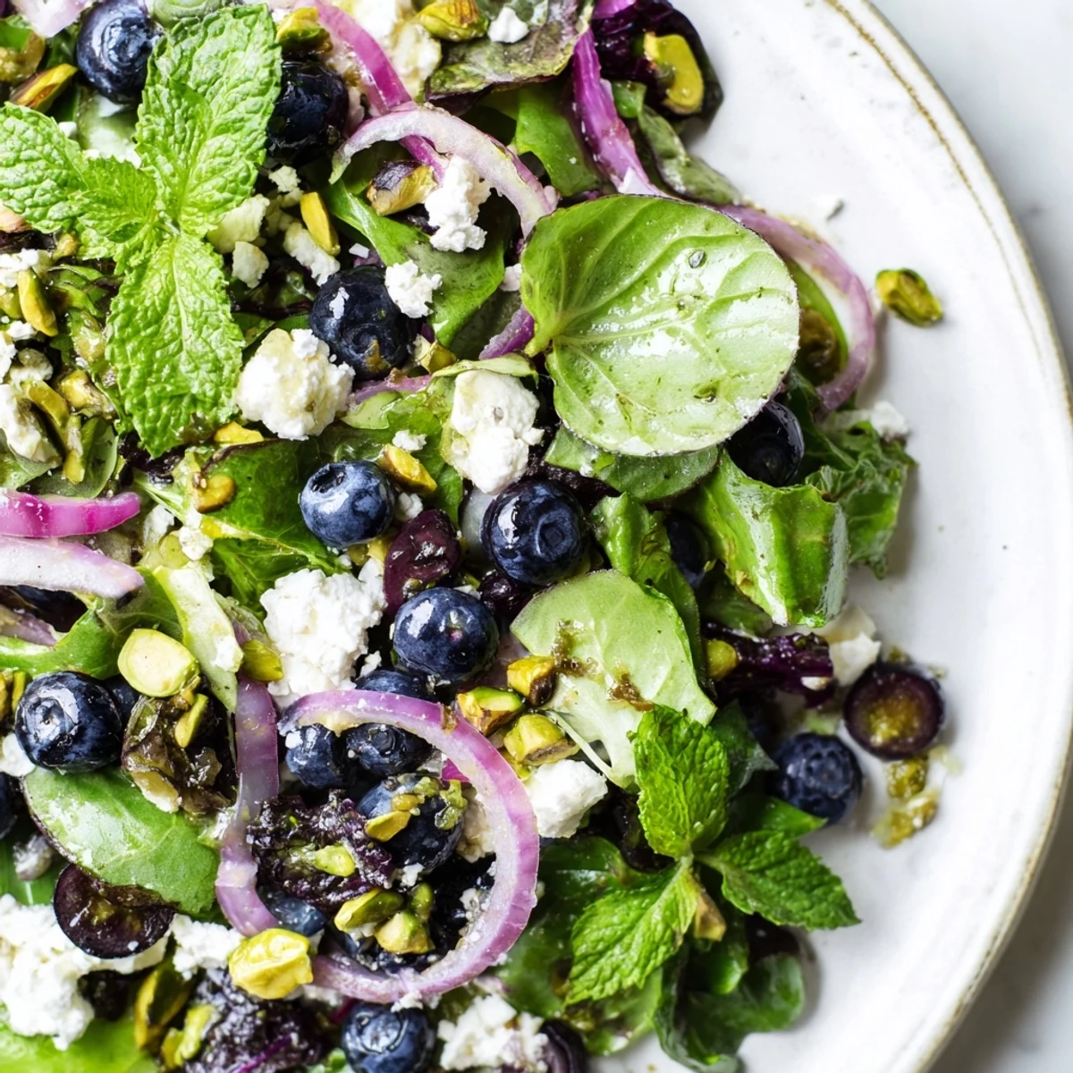 This refreshing bowl brings together the natural sweetness of fresh blueberries with the satisfying crunch of chopped pistachios. Baby spring greens and thinly sliced cucumber add crisp texture, while crumbled feta brings a creamy, tangy contrast that balances the sweetness. The house-made lemon-honey vinaigrette ties everything together with its bright citrus notes and subtle golden sweetness. Fresh torn mint leaves provide an aromatic finish that makes each bite feel light and revitalizing. Ready in just 15 minutes, this dish works beautifully as a standalone lunch or as an elegant starter that will impress guests.