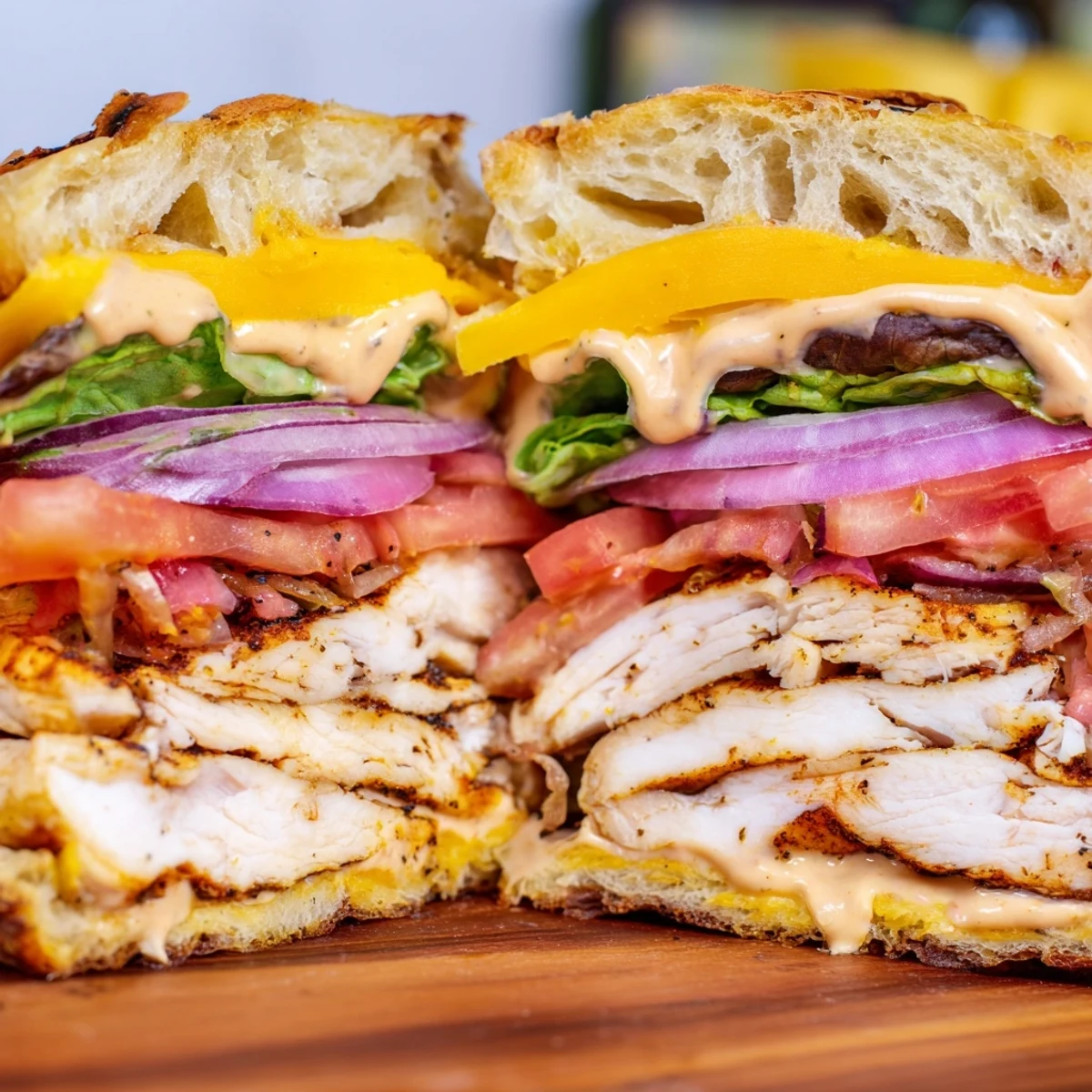 This hearty sandwich features seasoned grilled chicken breasts topped with melted cheddar cheese, layered with crisp romaine lettuce, ripe tomato slices, and thinly sliced red onion. The homemade sauce combines creamy mayonnaise with zesty Dijon mustard and fresh lemon juice for the perfect tangy finish.