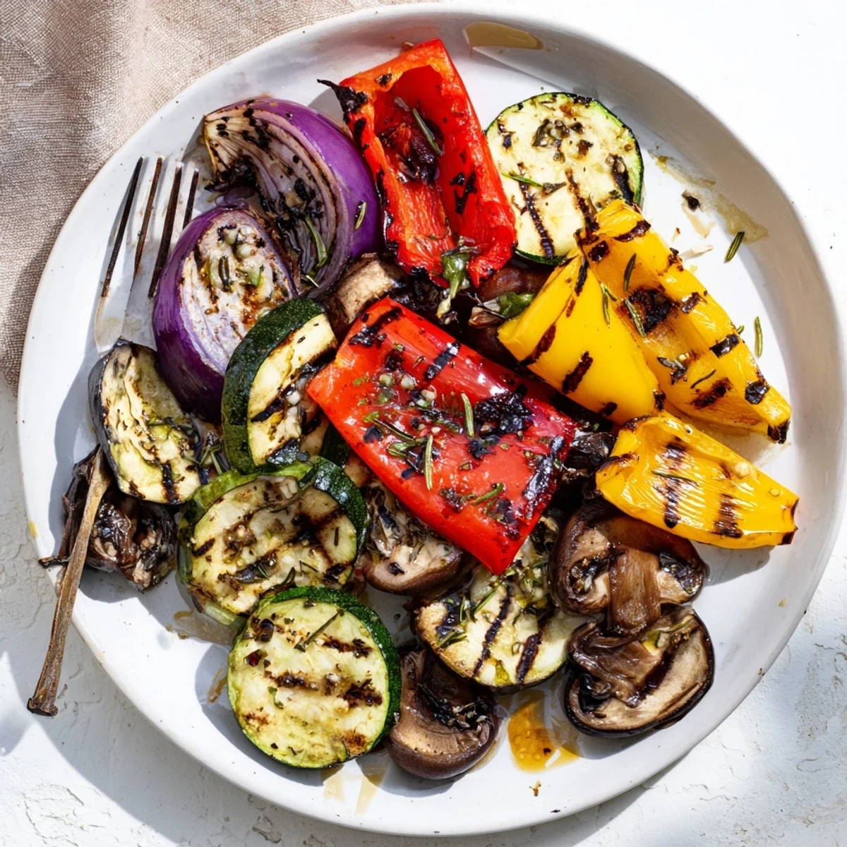 Marinate bell peppers, zucchini, eggplant, onion and mushrooms in extra virgin olive oil, balsamic, garlic, thyme and rosemary for 10–15 minutes. Grill on medium-high 4–5 minutes per side until charred and tender. Serve warm or room temperature as a colorful Mediterranean side; finish with a drizzle of leftover marinade, optional crumbled feta, or serve over grains.
