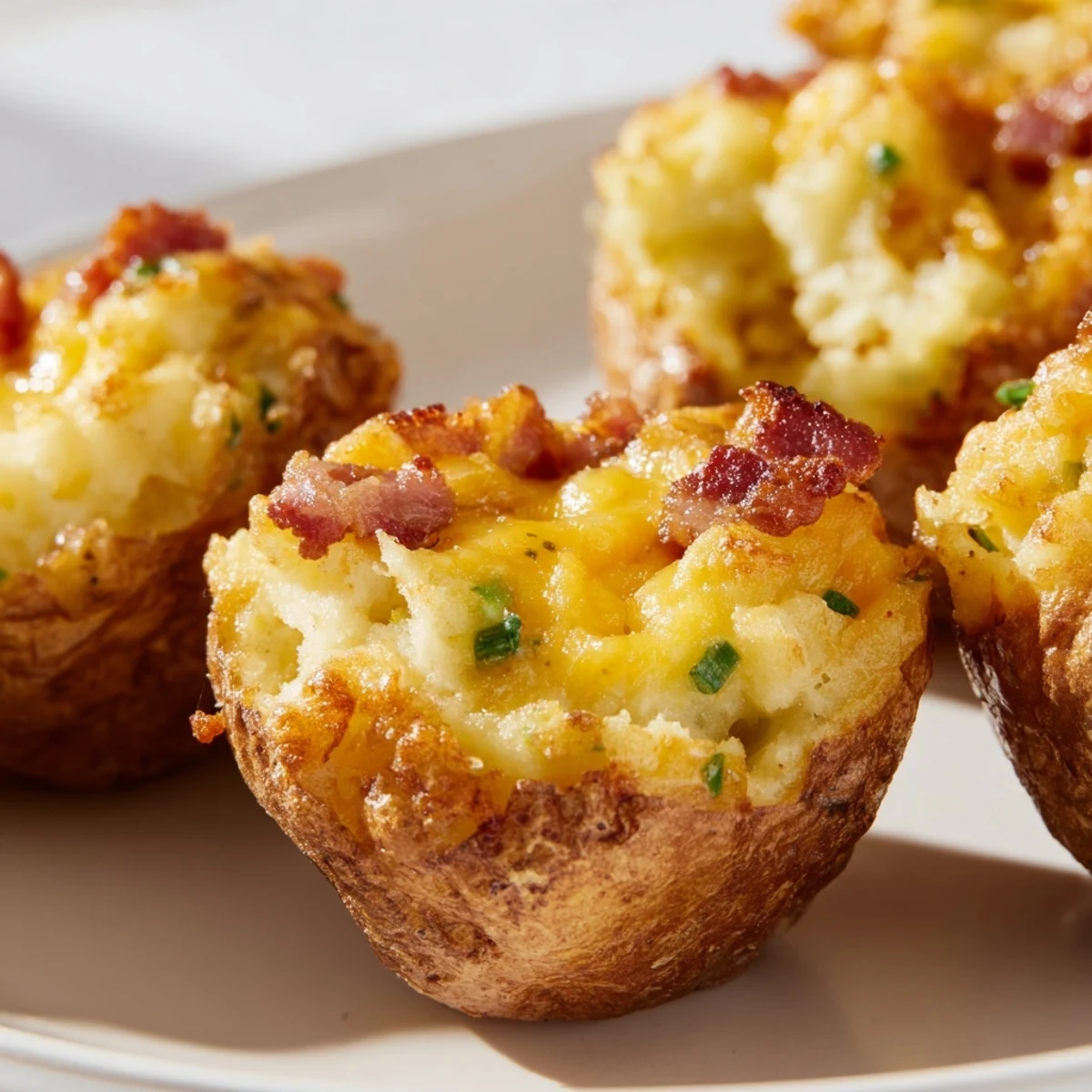 These bite-sized potatoes deliver the ultimate texture contrast—crispy golden skins giving way to fluffy, creamy centers loaded with smoky bacon and sharp cheddar. Each halved potato is carefully scooped, mashed, and enriched with sour cream and fresh chives before being mounded back into its shell and brushed with butter for that irresistible golden finish.